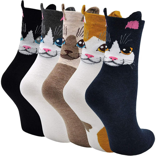 Womens Casual Cotton Crew Socks Cute Cat Animal Pattern Novelty Liner Ankle Socks for Women & Ladies, 5 Pairs