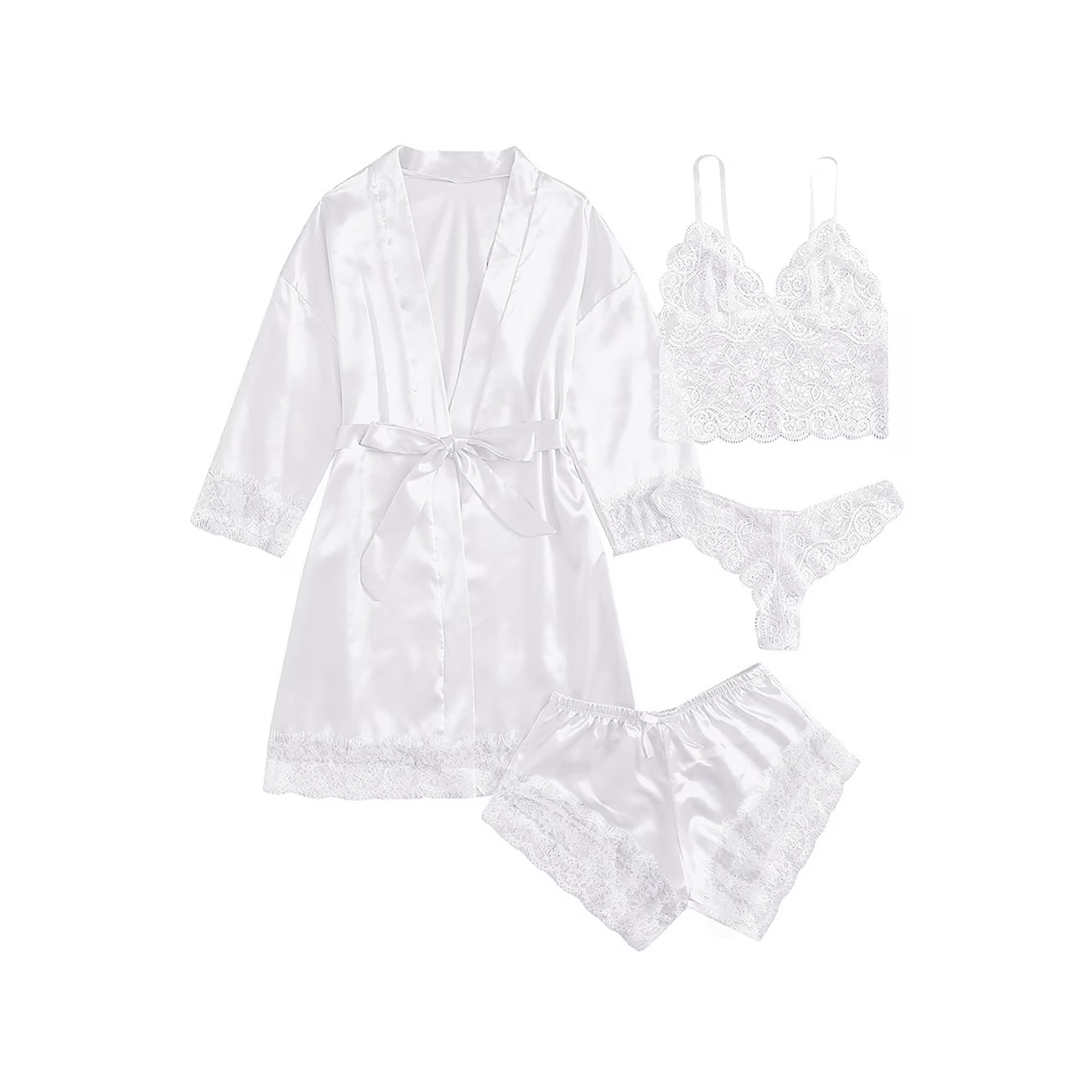 Sexy Lingerie, Artfasion Silk Satin Pajamas for Women, Womens Summer Pajamas Pjs Sets of 4 Pcs with Floral Lace Top Shorts and Robe, Gift for Women, Pink, L